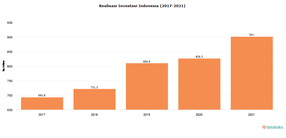 Realisasi investasi Indonesia mengalami tren peningkatan setiap tahunnya selama periode 2017-2021, dengan rata-rata peningkatan sebesar 6,9%. Berdasarkan data BKPM, realisasi investasi Indonesia pada 2017 sebesar Rp 692,8 triliun.